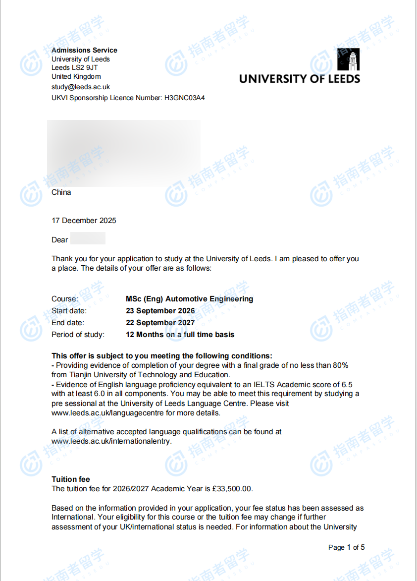 利茲大學(xué)汽車工程(工程)理學(xué)碩士研究生offer一枚