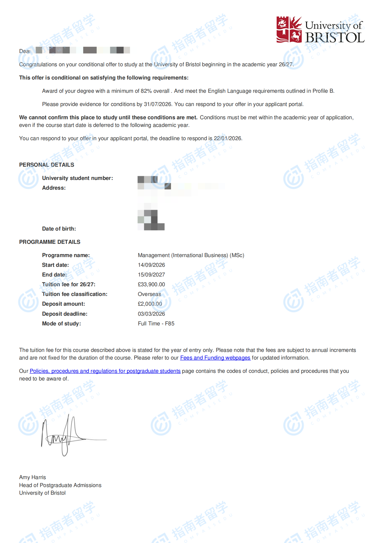 布里斯托大學(xué)管理學(xué)理學(xué)碩士(國(guó)際商務(wù))研究生offer一枚