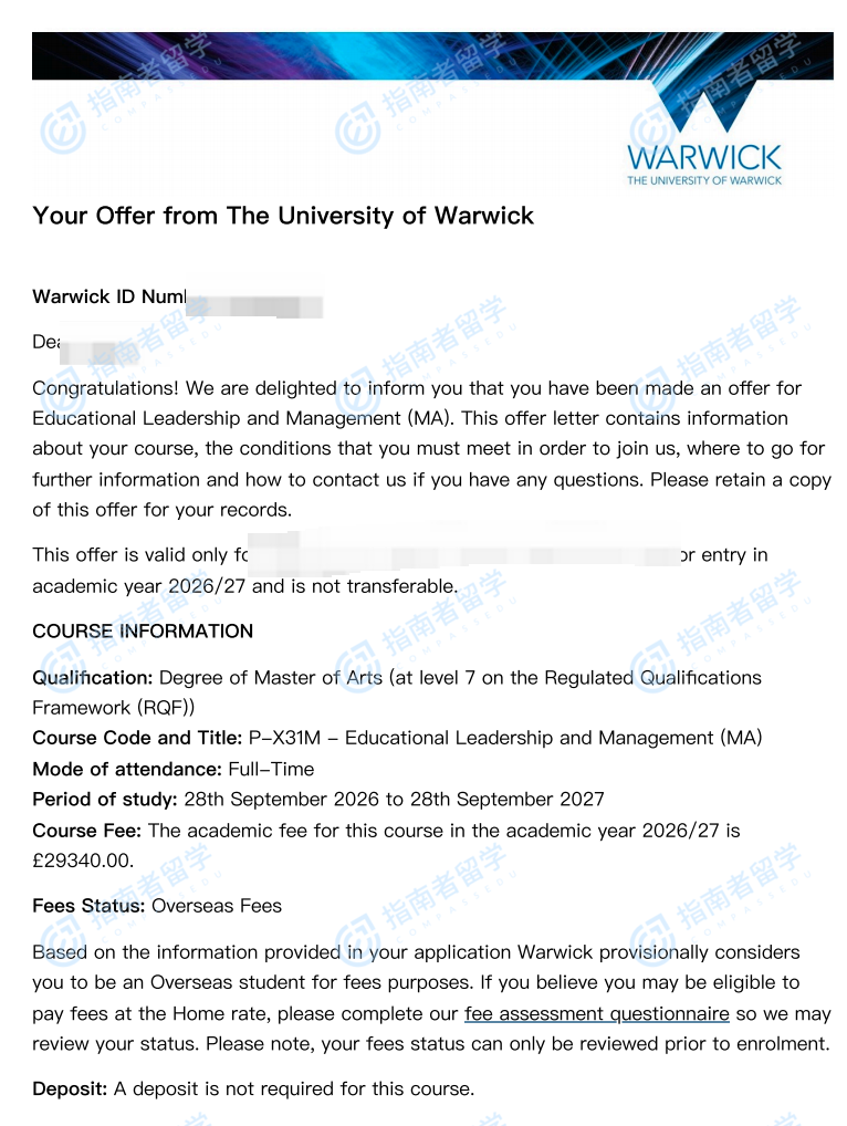 華威大學(xué)教育領(lǐng)導(dǎo)與管理文學(xué)碩士研究生offer一枚