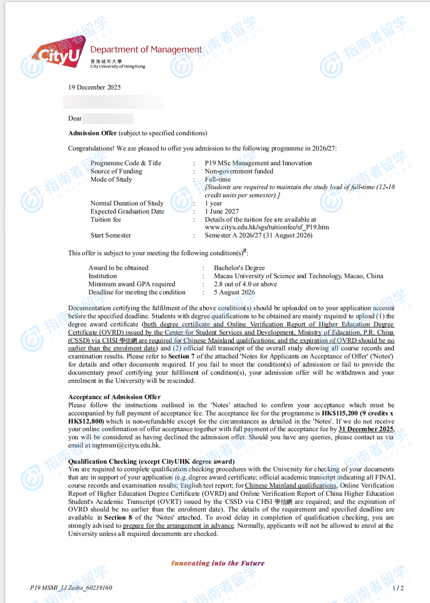 香港城市大學(xué)管理與創(chuàng)新理學(xué)碩士研究生offer一枚