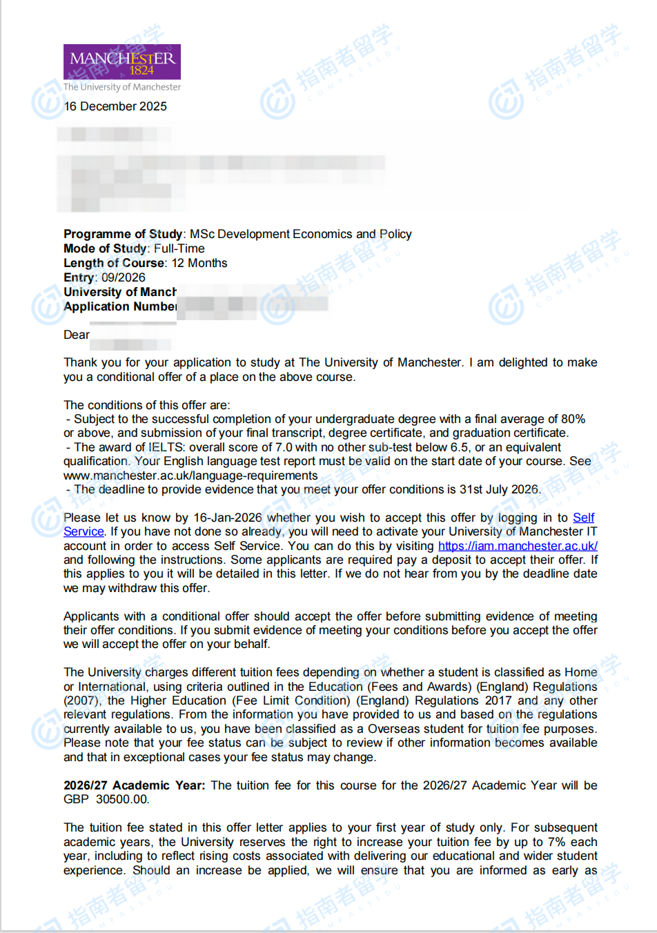 曼徹斯特大學(xué)發(fā)展經(jīng)濟(jì)與政策理學(xué)碩士研究生offer一枚