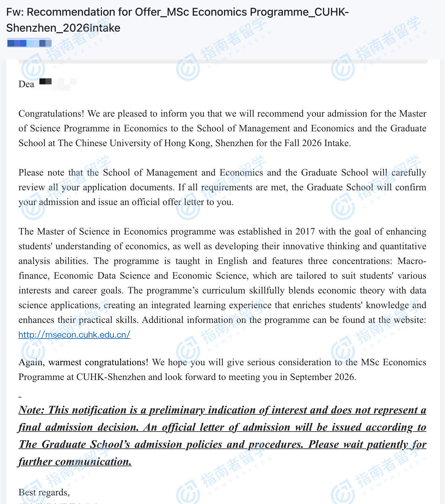 香港中文大學經(jīng)濟學理學碩士(CUHK-Shenzhen)研究生offer一枚