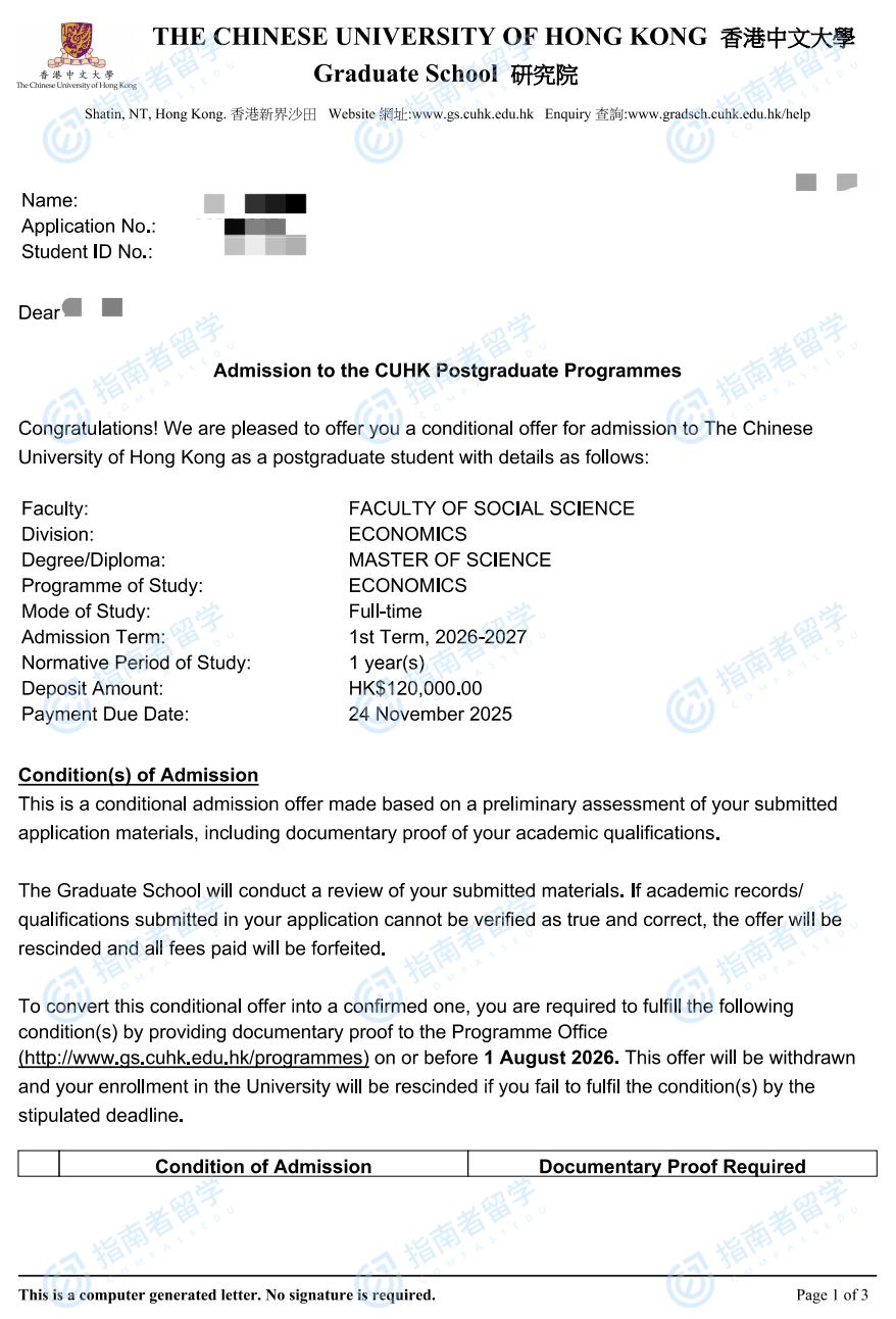 香港中文大學(xué)經(jīng)濟(jì)學(xué)理學(xué)碩士研究生offer一枚