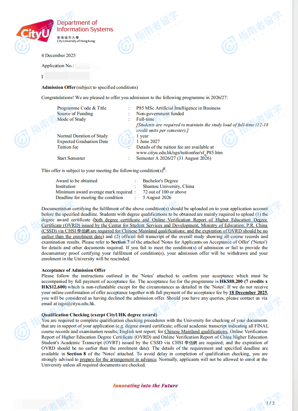 香港城市大學(xué)商業(yè)人工智能理學(xué)碩士研究生offer一枚
