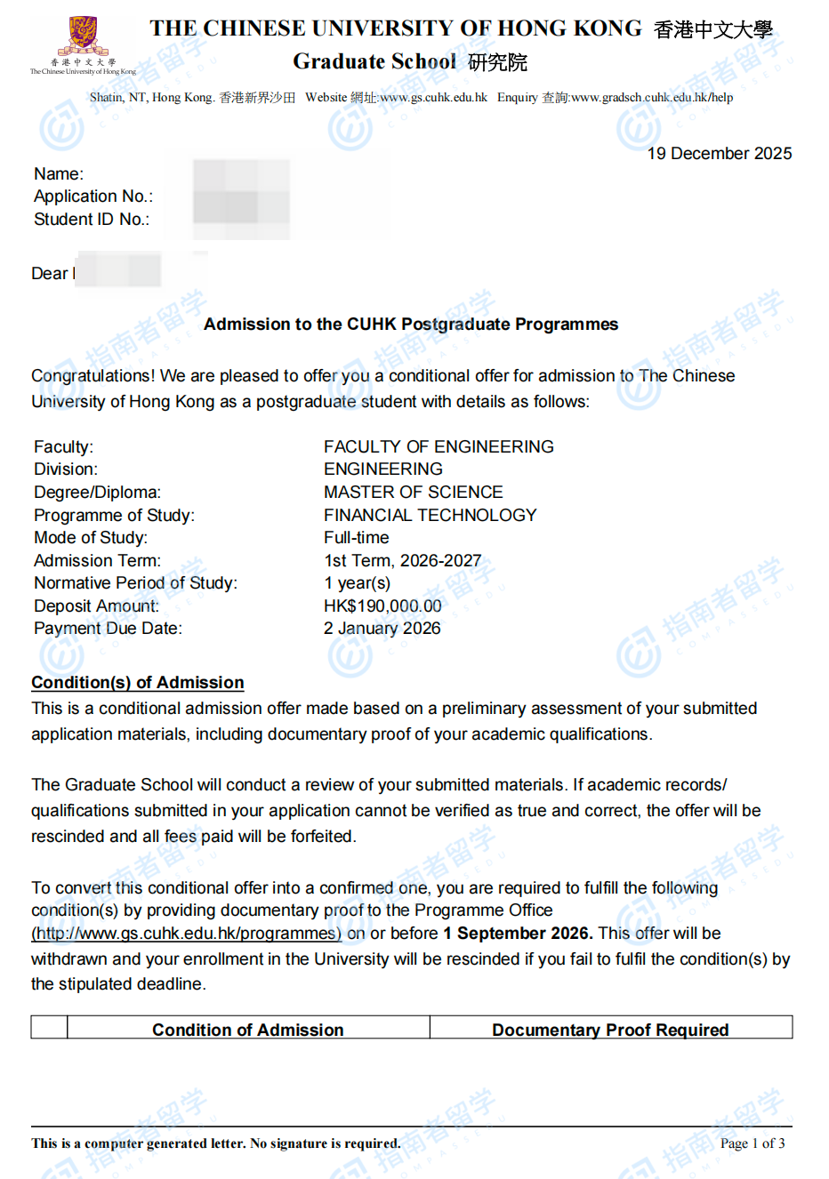 香港中文大學(xué)金融科技理學(xué)碩士研究生offer一枚