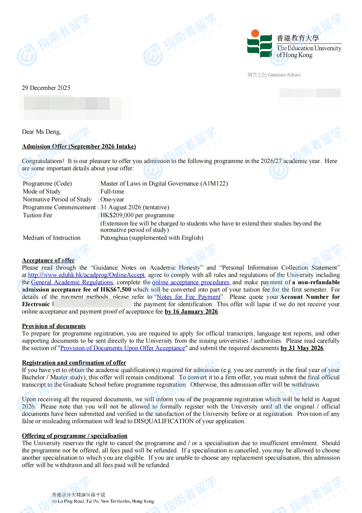 香港教育大學數(shù)碼管治法學碩士研究生offer一枚