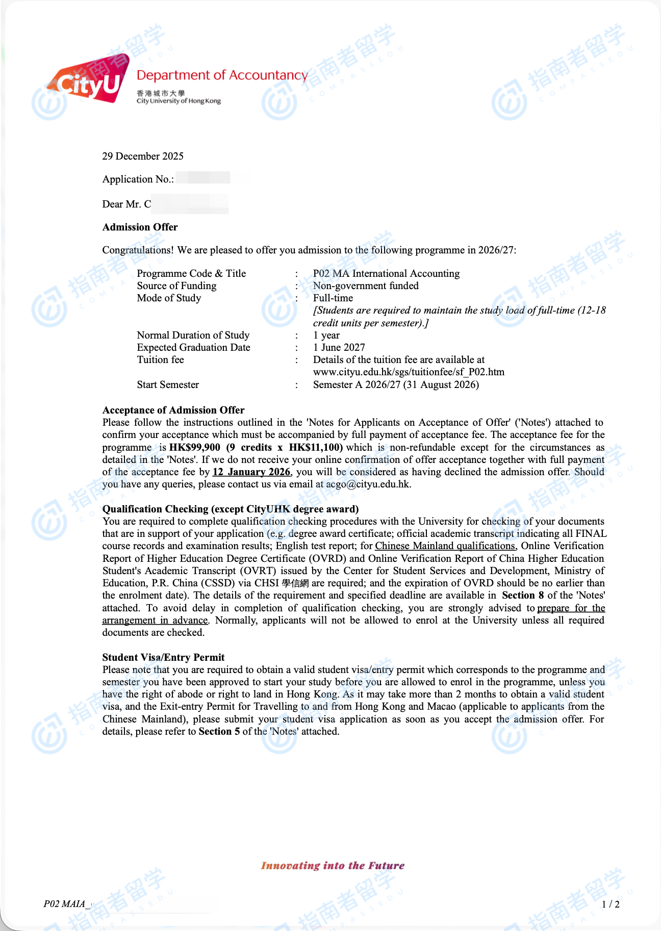 香港城市大學國際會計學文學碩士研究生offer一枚