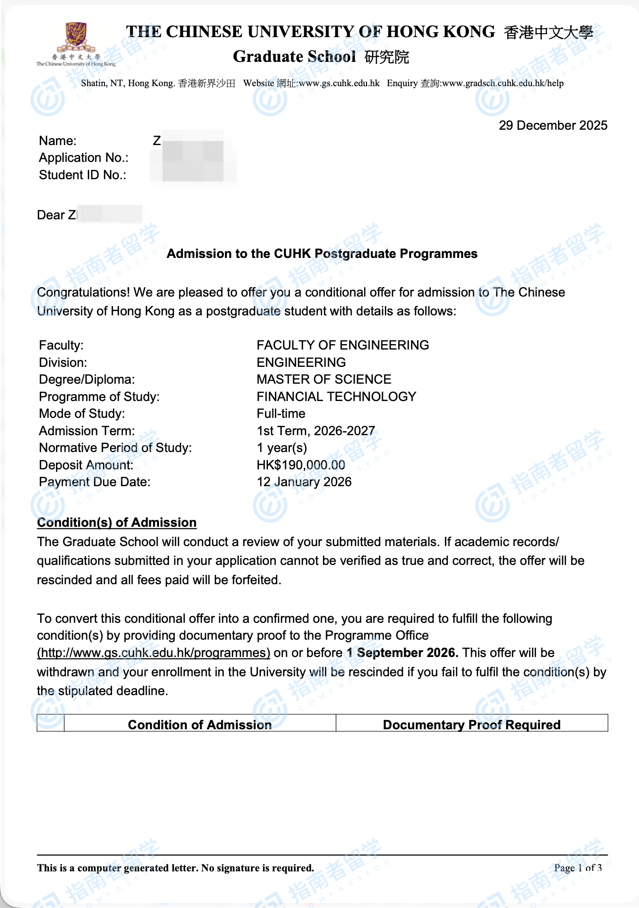 香港中文大學(xué)金融科技理學(xué)碩士研究生offer一枚