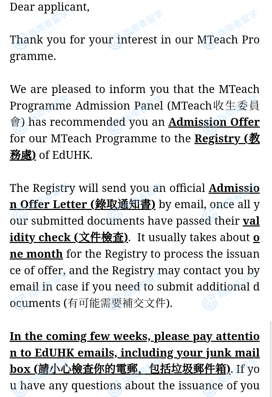 香港教育大學(xué)教學(xué)碩士研究生offer一枚