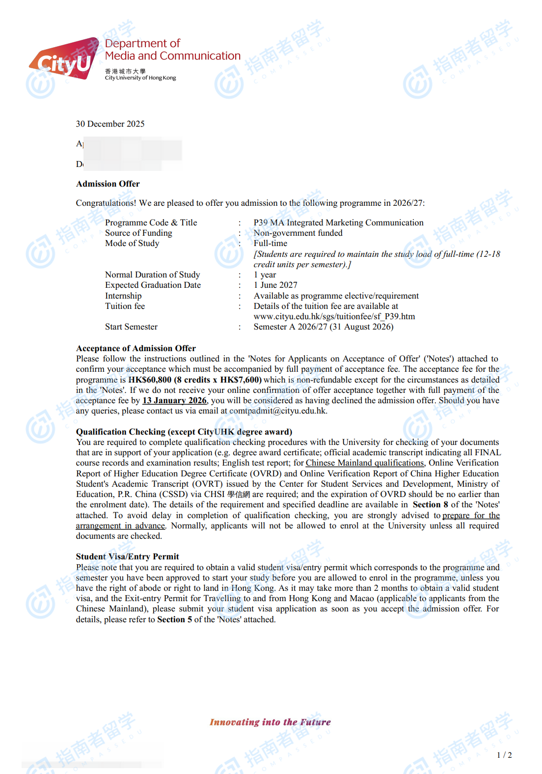 香港城市大學(xué)整合營銷傳播文學(xué)碩士研究生offer一枚