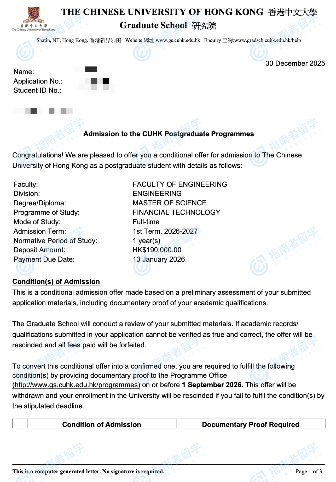 香港中文大學(xué)金融科技理學(xué)碩士研究生offer一枚