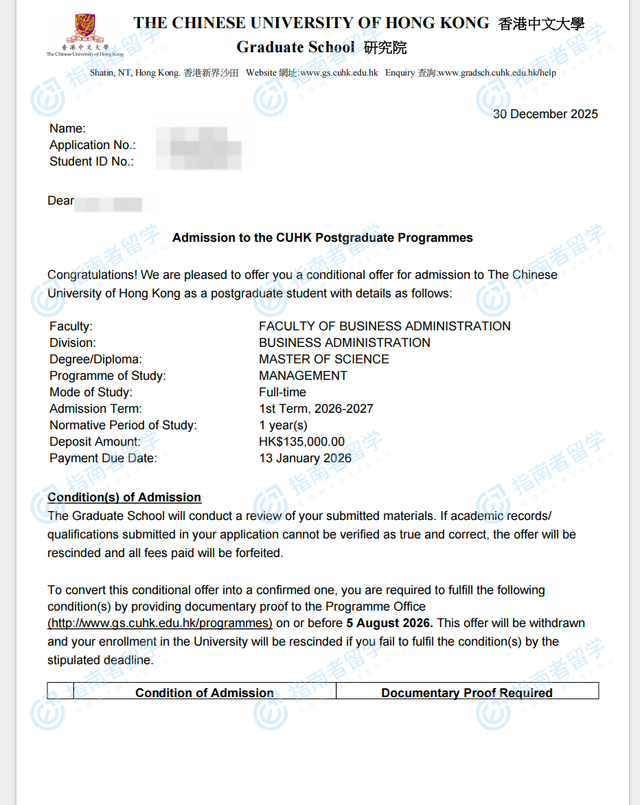 香港中文大學(xué)管理學(xué)理學(xué)碩士研究生offer一枚