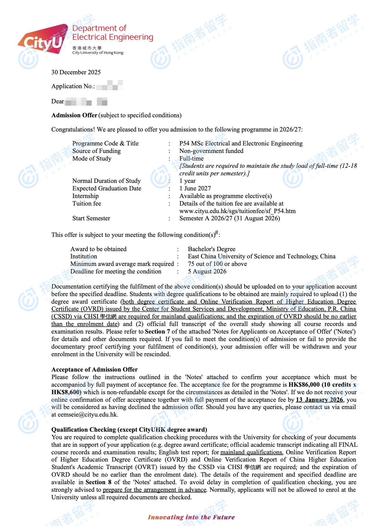 香港城市大學(xué)電機與電子工程學(xué)理學(xué)碩士研究生offer一枚