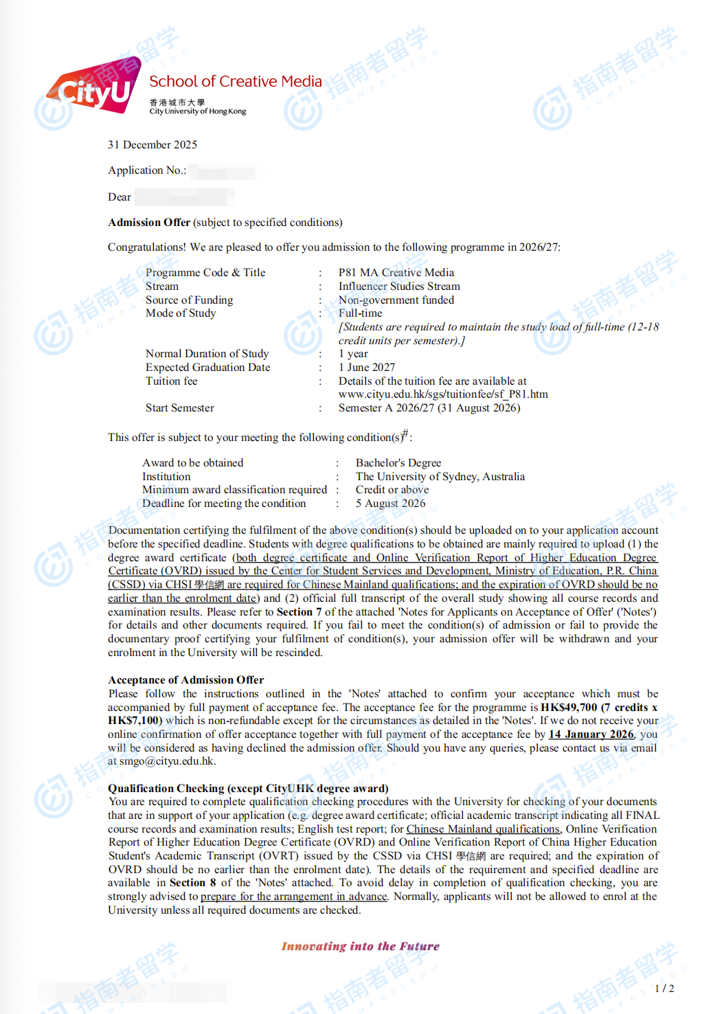 香港城市大學(xué)創(chuàng)意媒體文學(xué)碩士研究生offer一枚