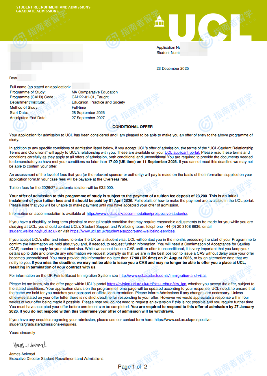 倫敦大學(xué)學(xué)院比較教育文學(xué)碩士研究生offer一枚