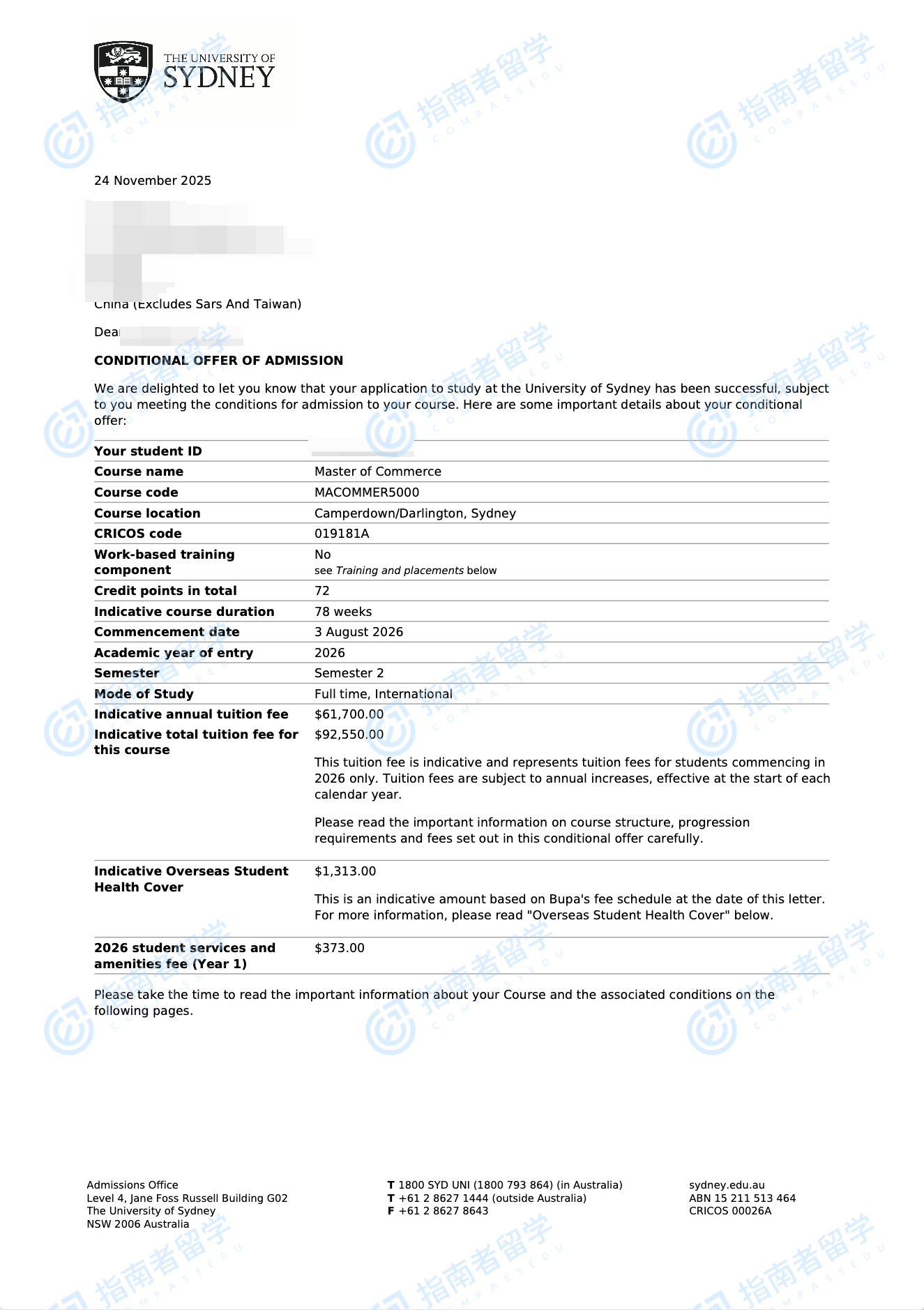 悉尼大學商學碩士研究生offer一枚