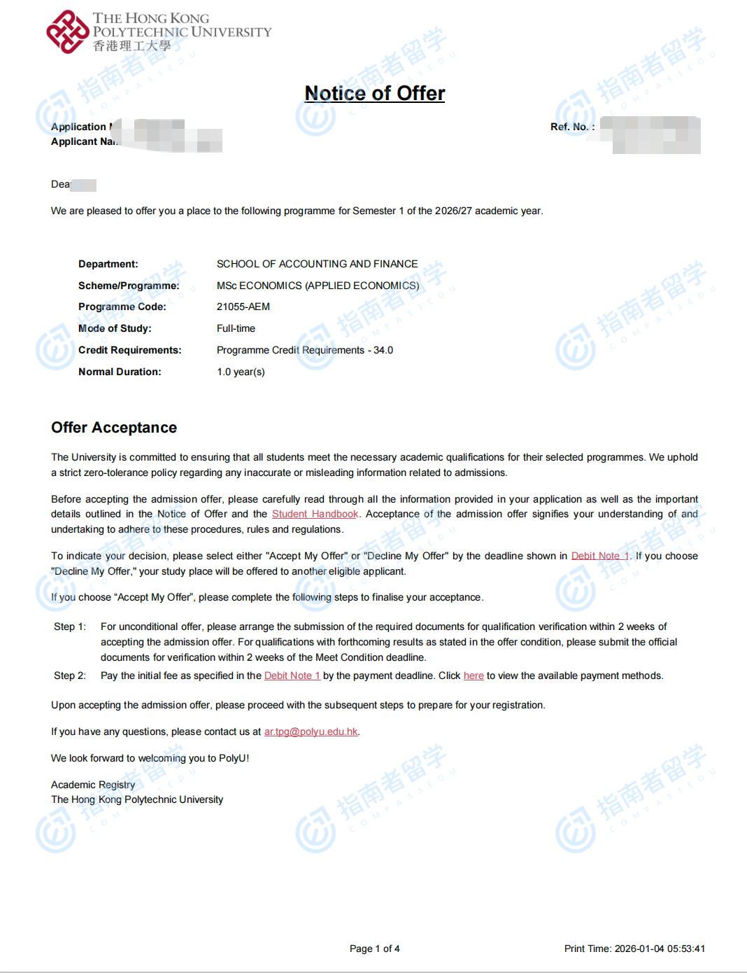香港理工大學(xué)經(jīng)濟學(xué)理學(xué)碩士(應(yīng)用經(jīng)濟學(xué))研究生offer一枚