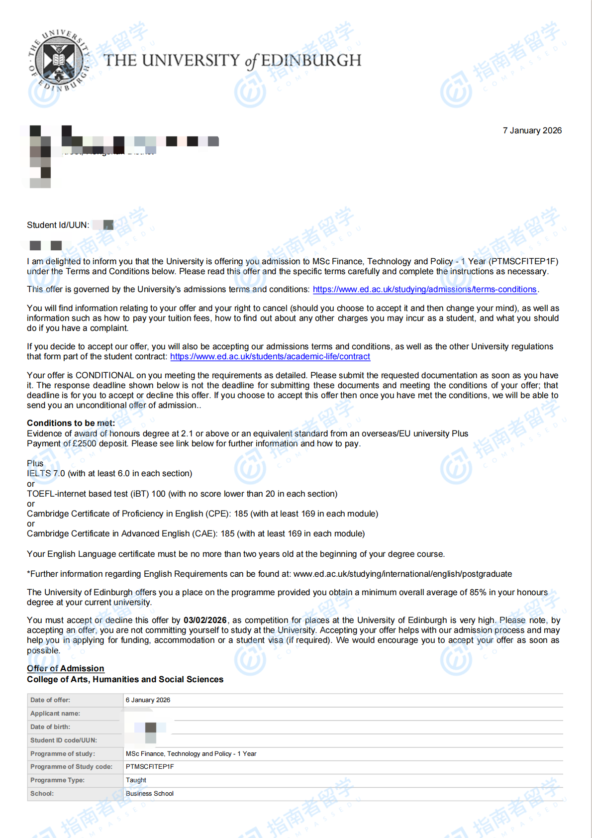 愛(ài)丁堡大學(xué)金融、科技與政策理學(xué)碩士研究生offer一枚
