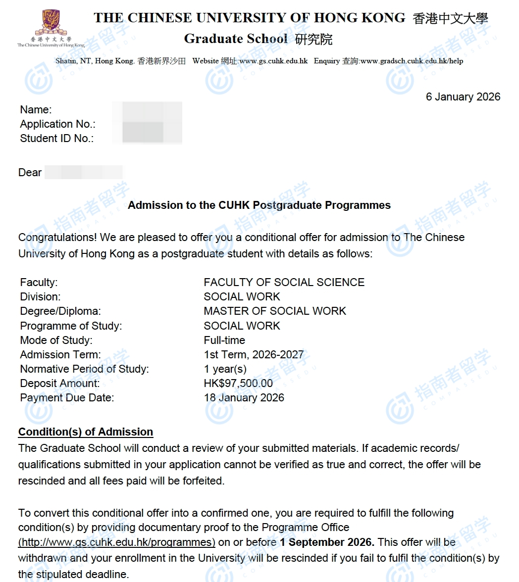 香港中文大學(xué)社會工作碩士研究生offer一枚