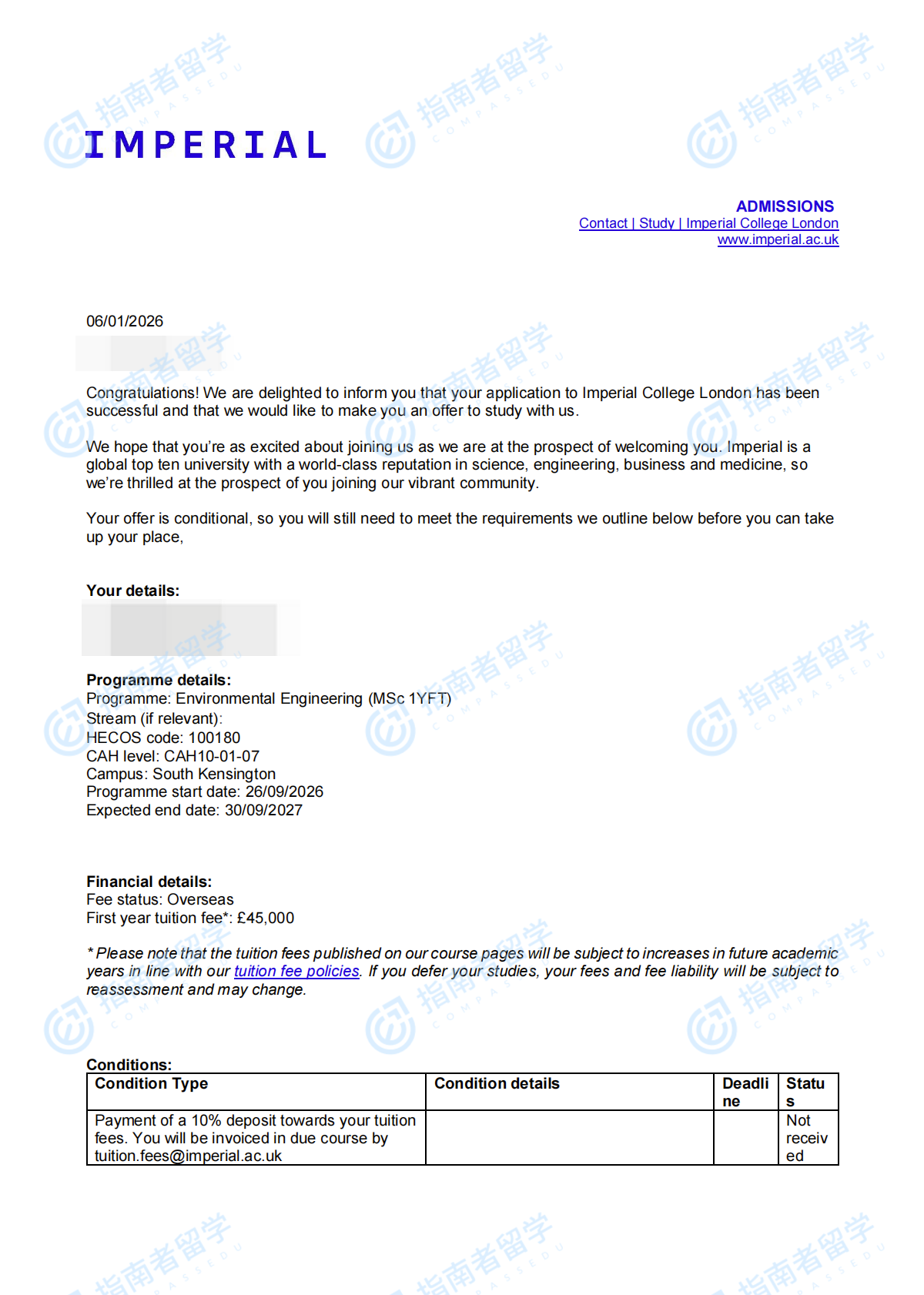 帝國理工學(xué)院環(huán)境工程理學(xué)碩士研究生offer一枚