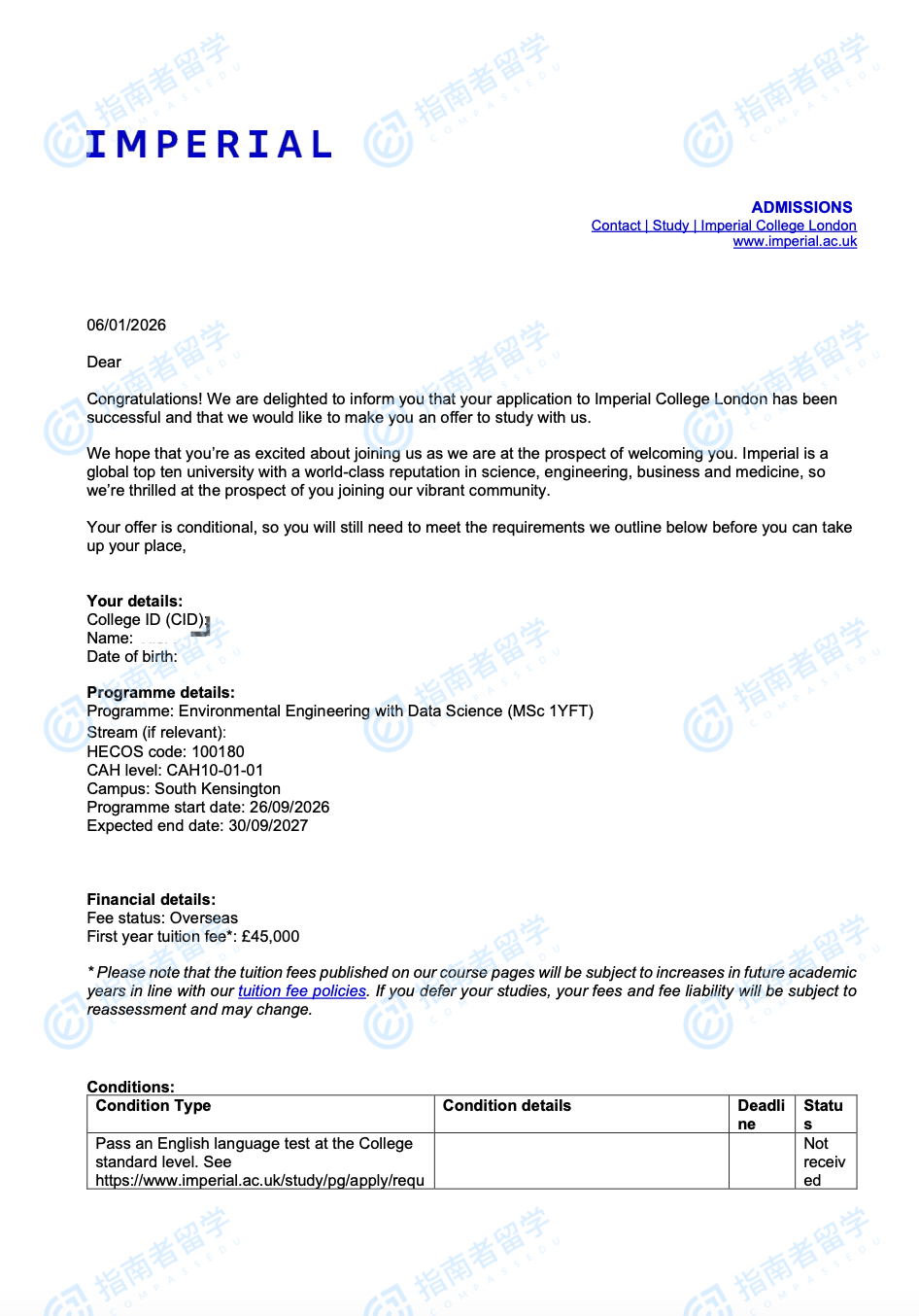 帝國理工學院環(huán)境工程與數(shù)據(jù)科學理學碩士研究生offer一枚