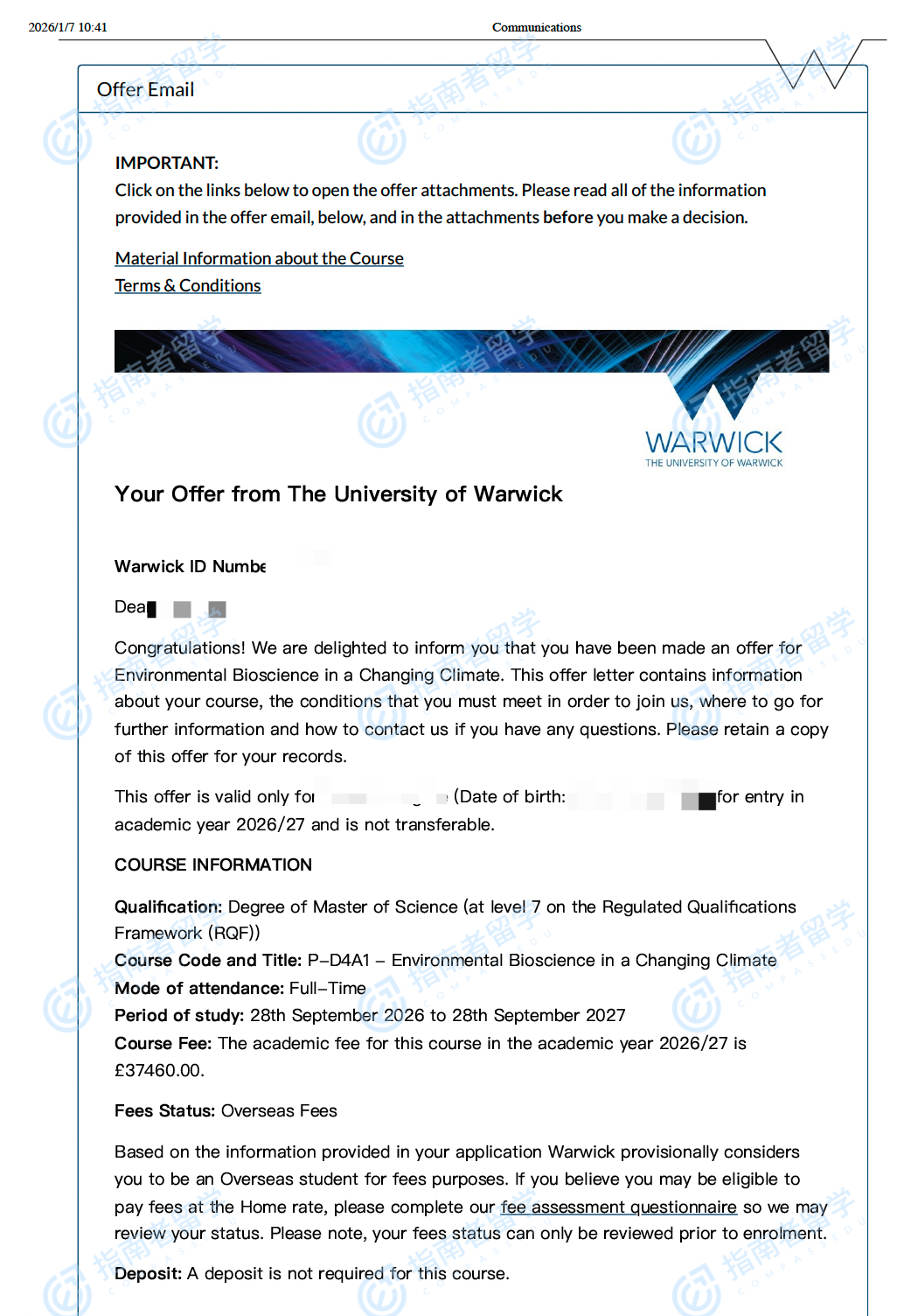 華威大學氣候變化下的環(huán)境生物科學理學碩士研究生offer一枚