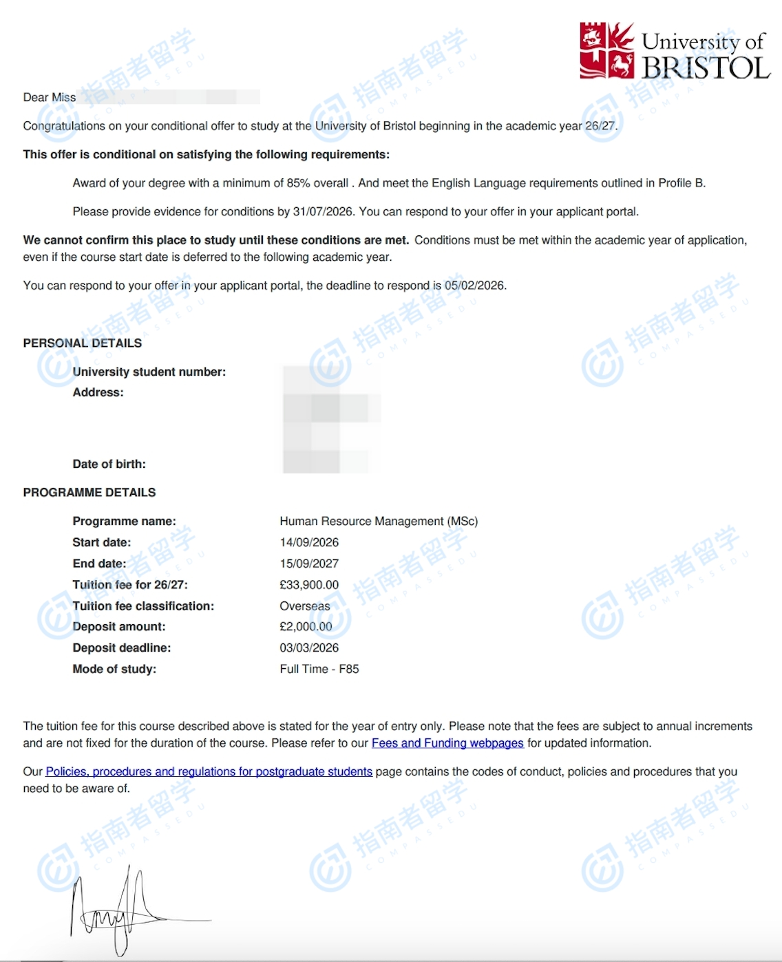 布里斯托大學(xué)人力資源管理理學(xué)碩士研究生offer一枚