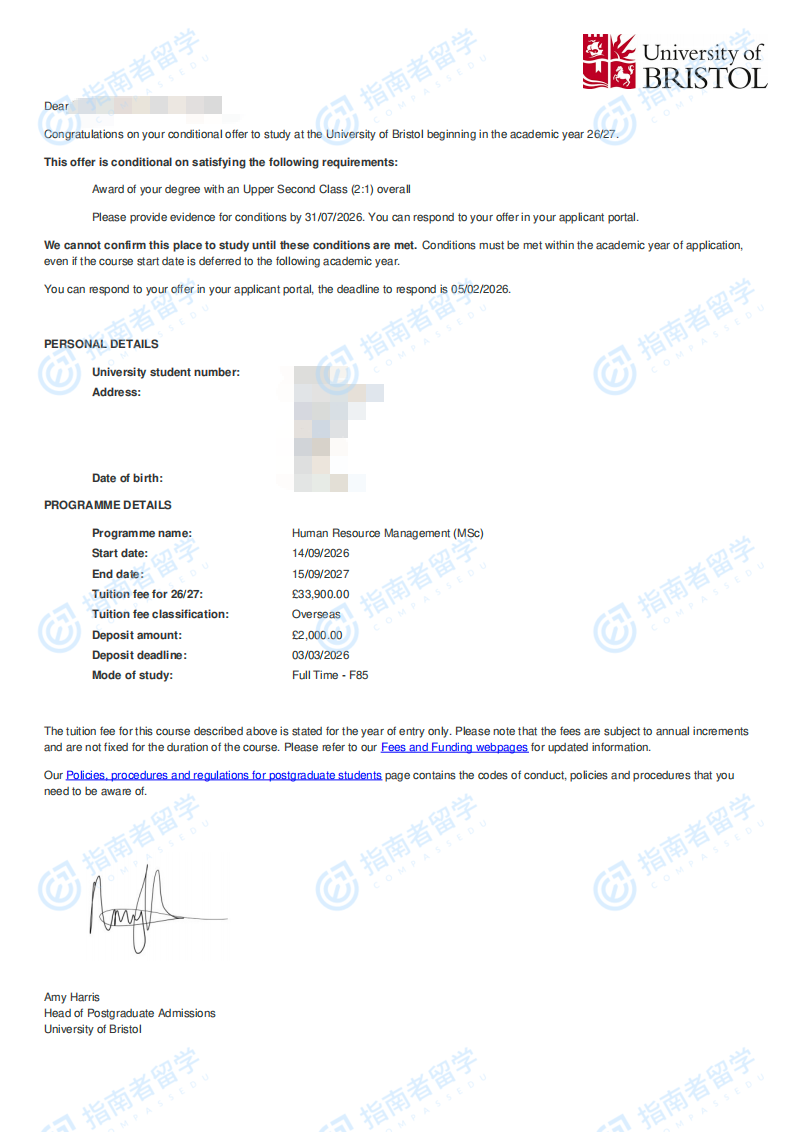 布里斯托大學管理學理學碩士(國際人力資源管理)研究生offer一枚