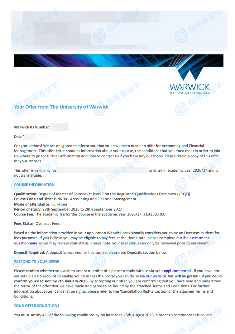 華威大學(xué)會計(jì)與財(cái)務(wù)管理理學(xué)碩士研究生offer一枚