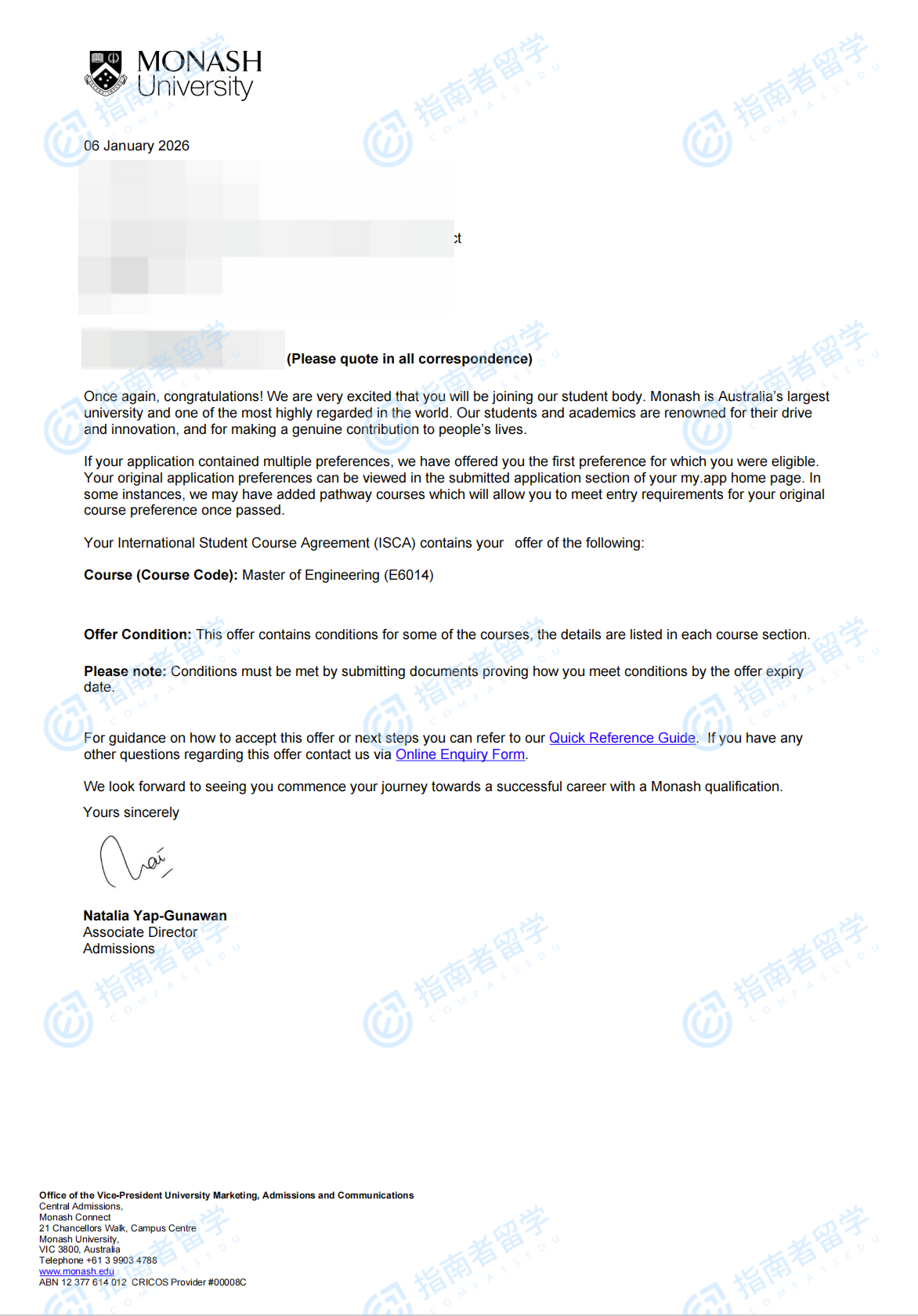 莫納什大學(xué)電氣工程工學(xué)碩士研究生offer一枚