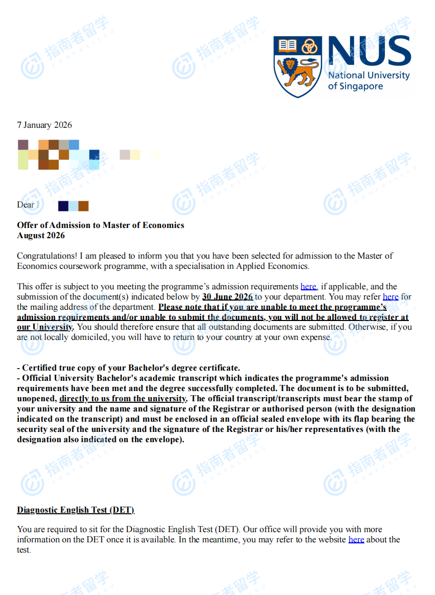 新加坡國立大學經(jīng)濟學碩士研究生offer一枚