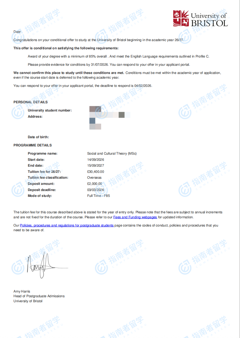 布里斯托大學(xué)社會與文化理論理學(xué)碩士研究生offer一枚