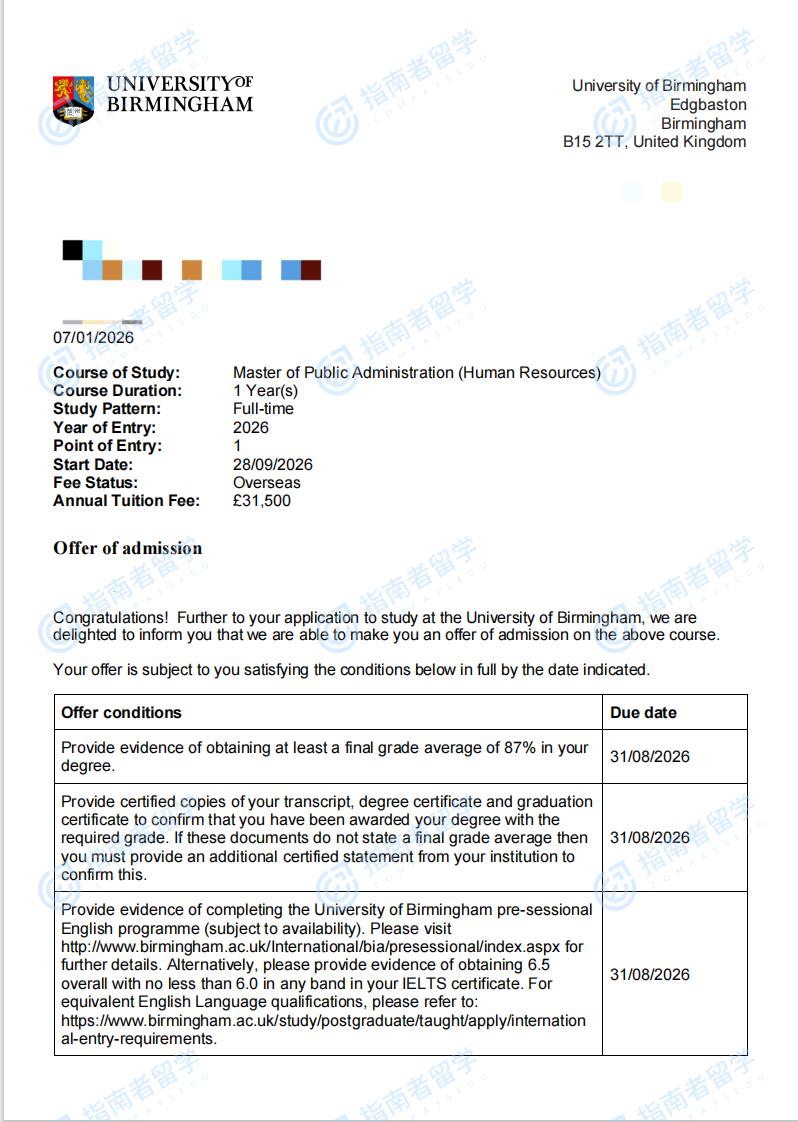 伯明翰大學公共管理碩士(人力資源)研究生offer一枚