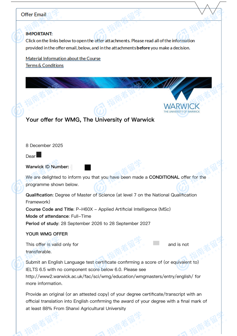 華威大學人工智能應用理學碩士研究生offer一枚