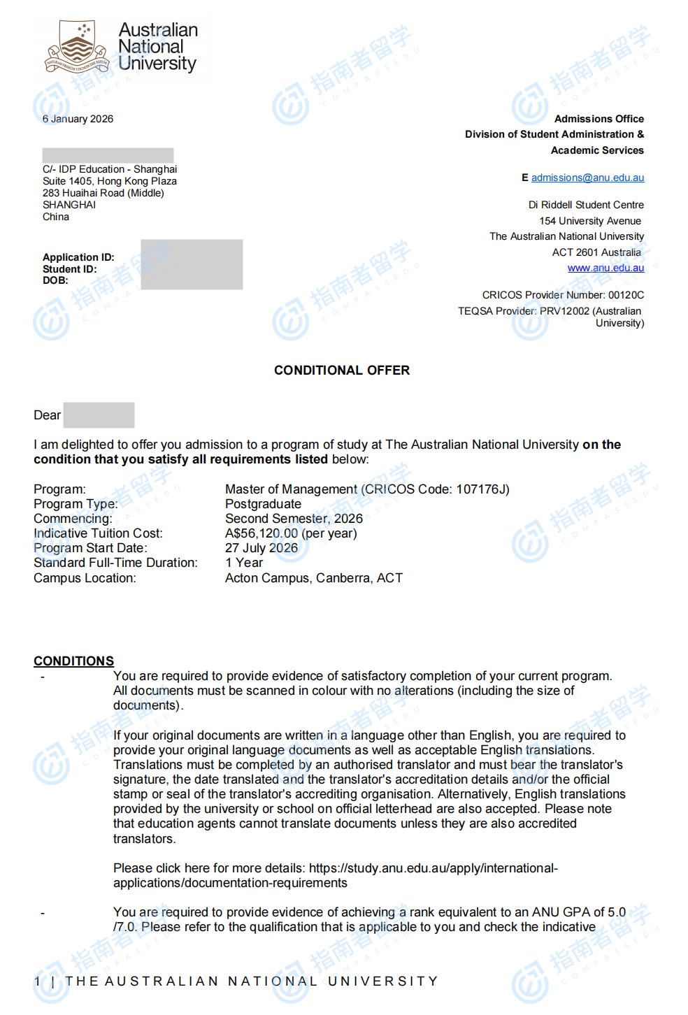 澳大利亞國(guó)立大學(xué)管理學(xué)碩士研究生offer一枚