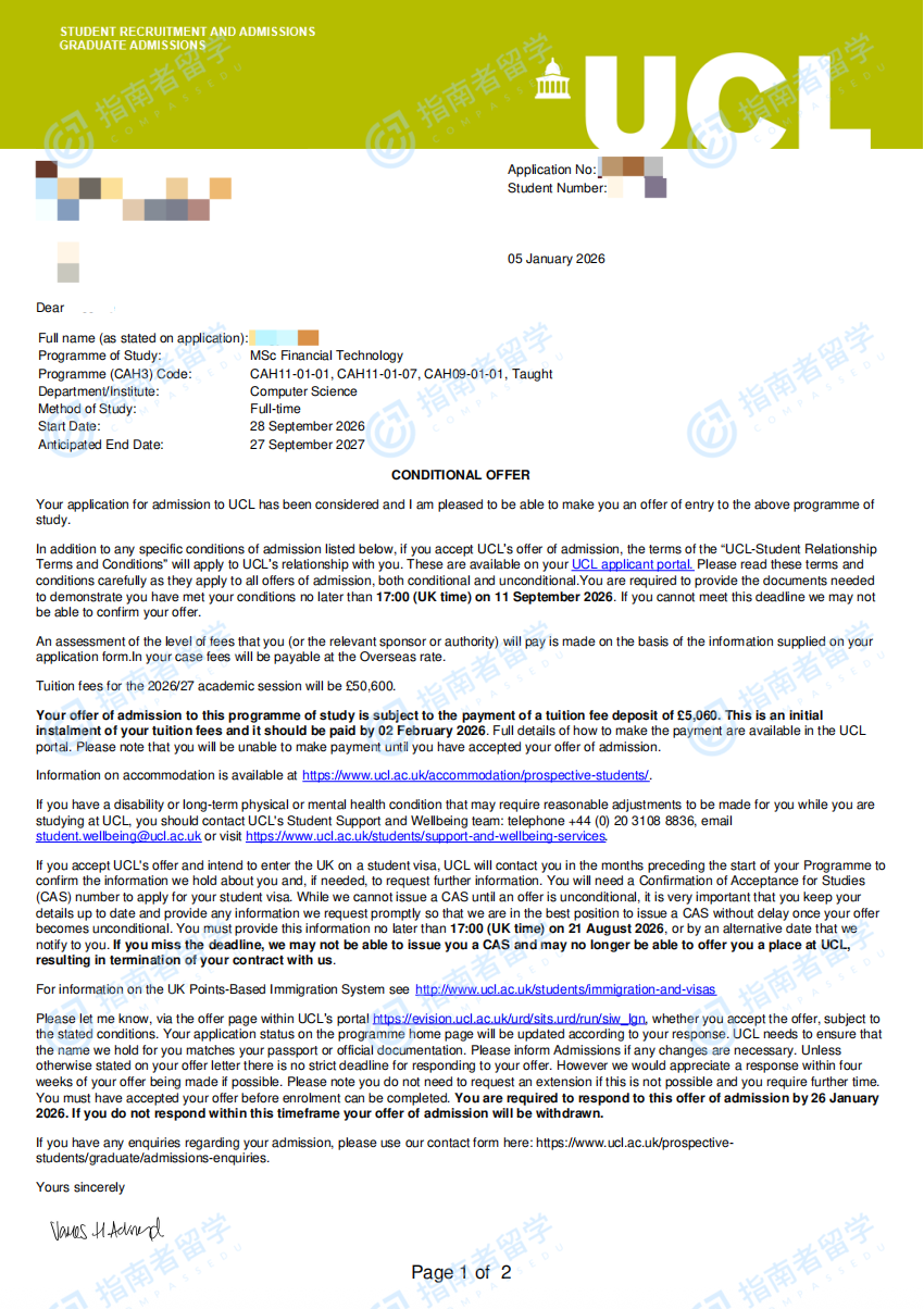 倫敦大學(xué)學(xué)院金融科技理學(xué)碩士研究生offer一枚