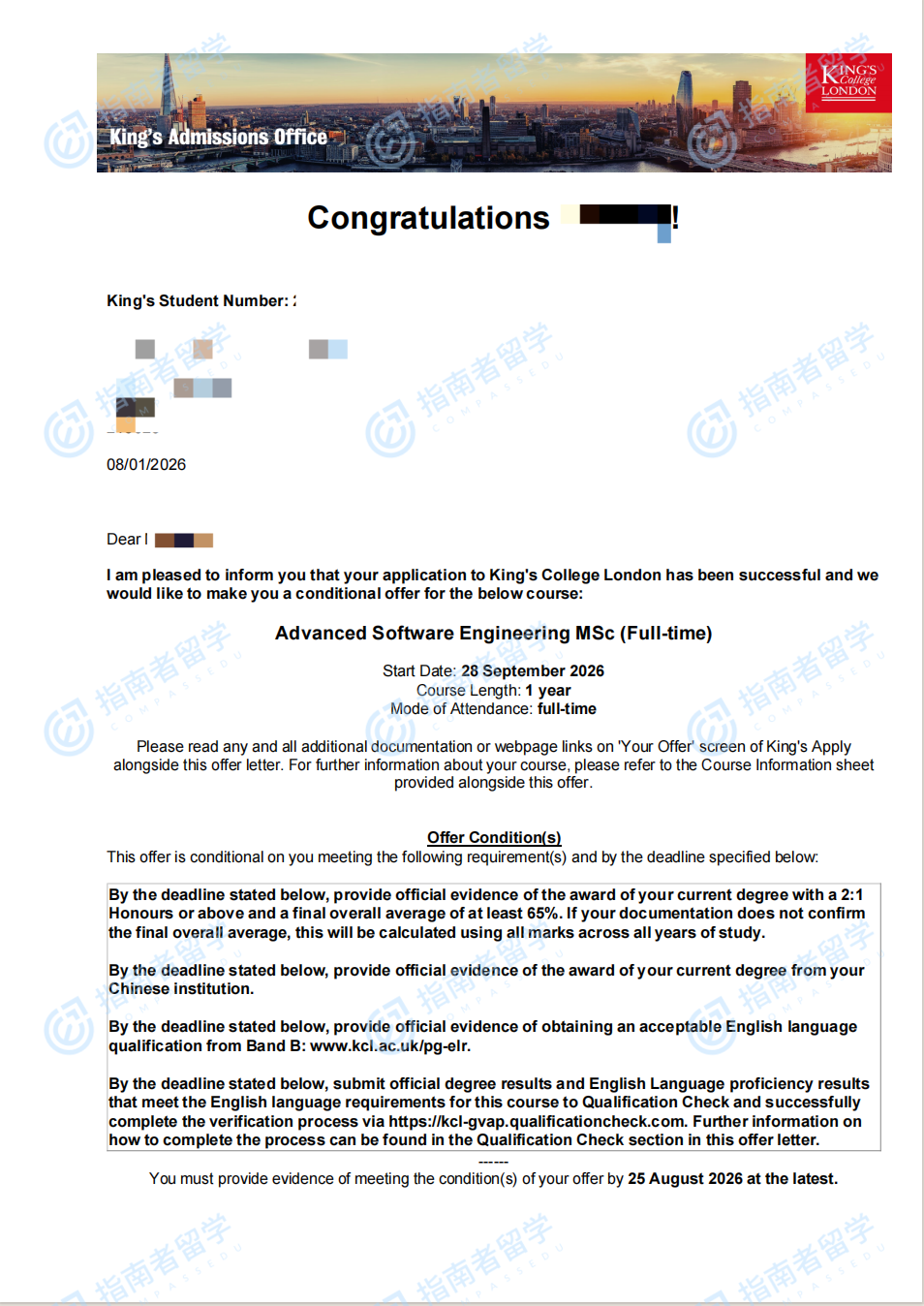 倫敦大學(xué)國王學(xué)院高級軟件工程理學(xué)碩士研究生offer一枚