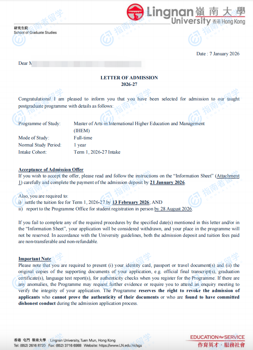 香港嶺南大學(xué)國際高等教育與管理文學(xué)碩士研究生offer一枚