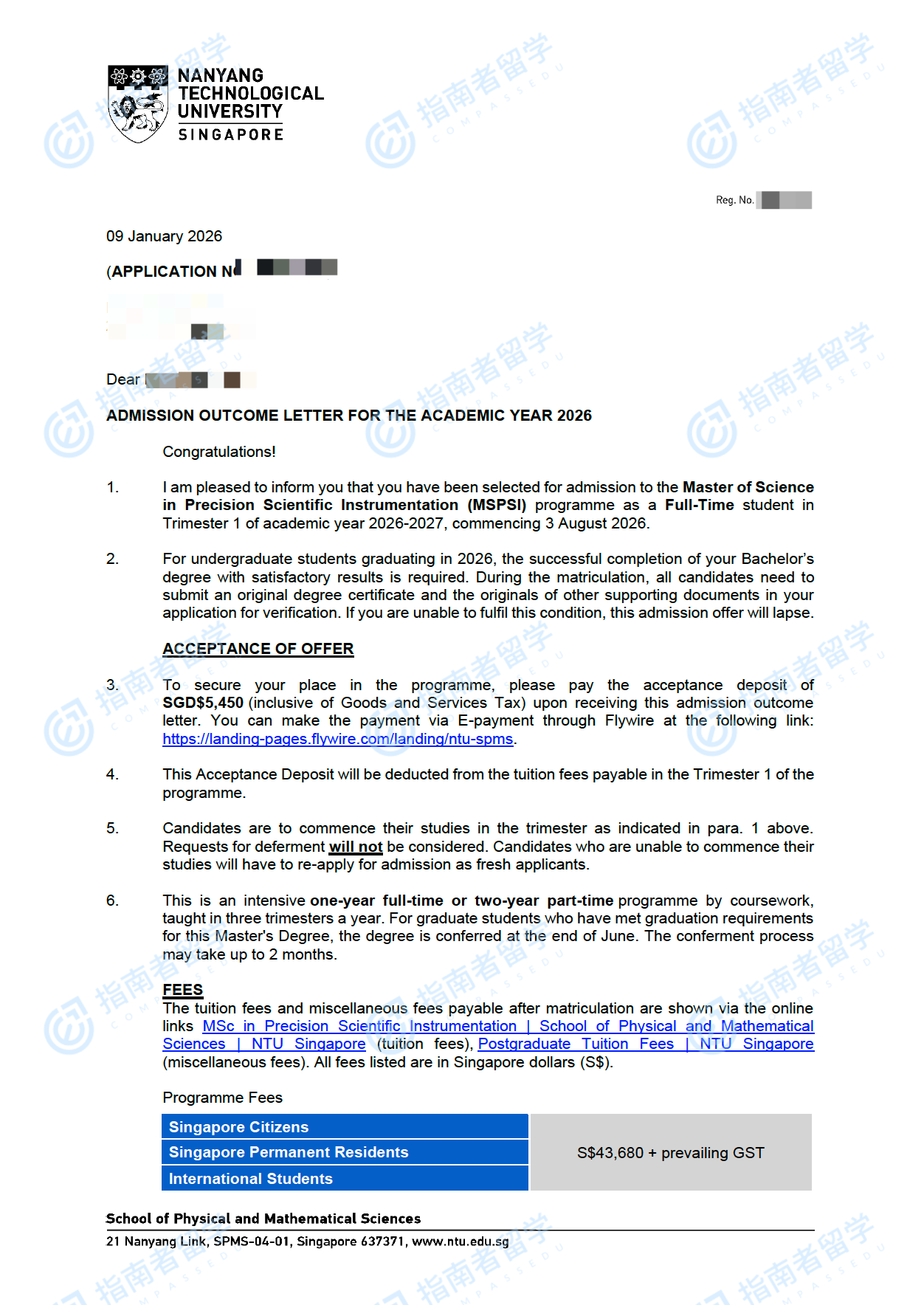 南洋理工大學精密科學儀器理學碩士研究生offer一枚
