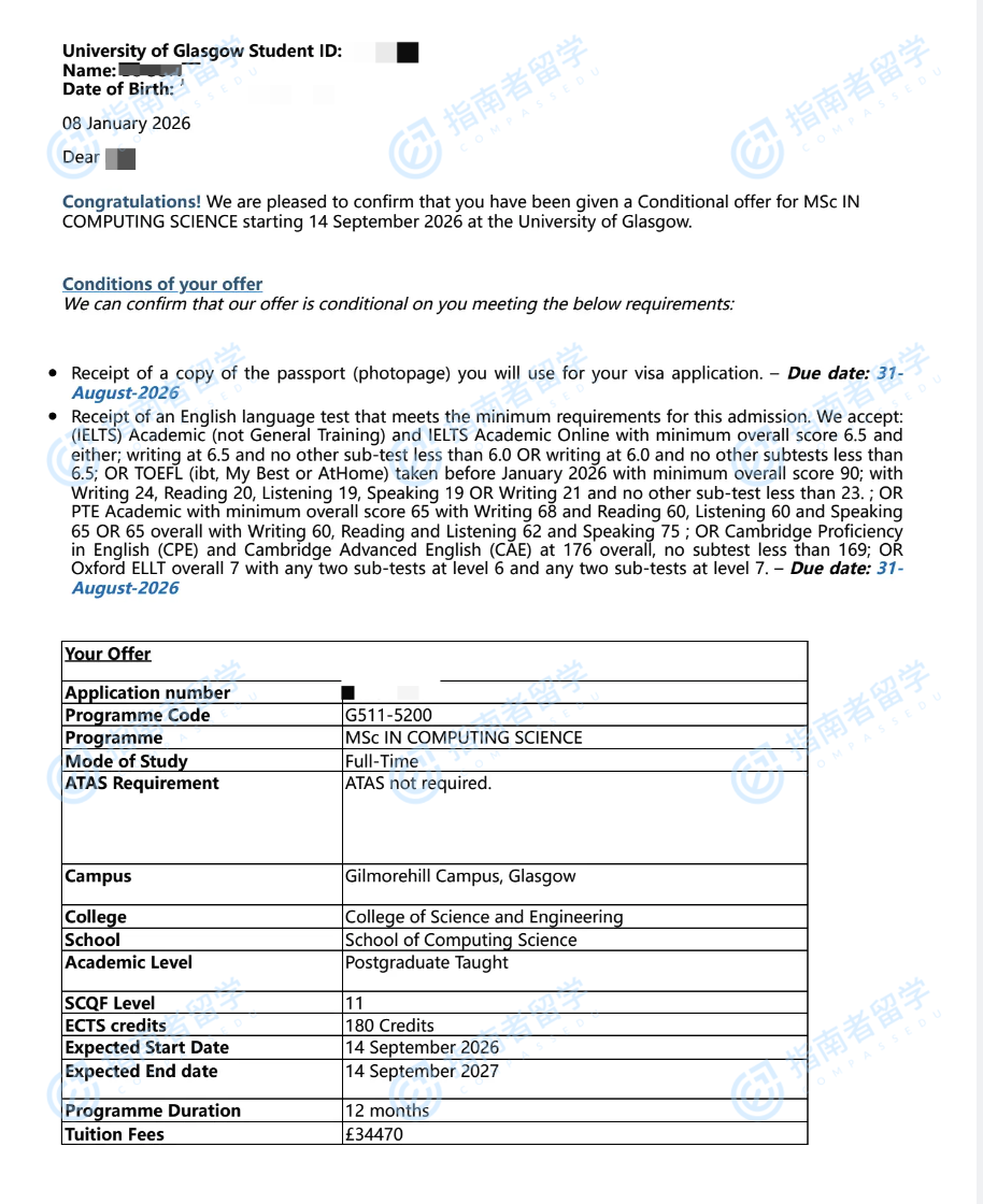 格拉斯哥大學計算科學理學碩士研究生offer一枚