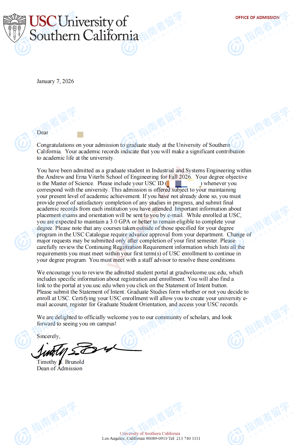 南加州大學(xué)工業(yè)與系統(tǒng)工程理學(xué)碩士研究生offer一枚