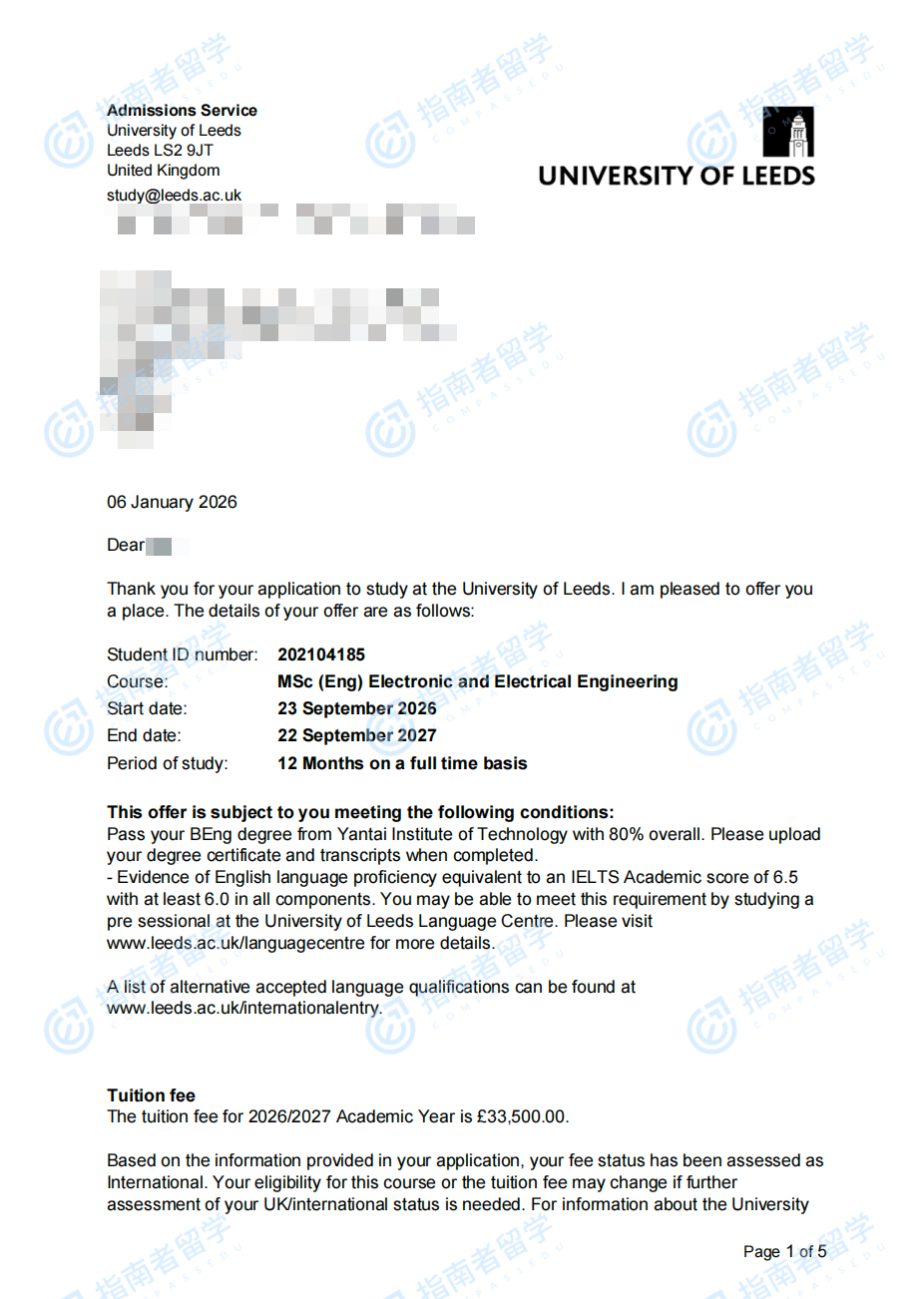 利茲大學(xué)電子與電氣工程(工程)理學(xué)碩士研究生offer一枚
