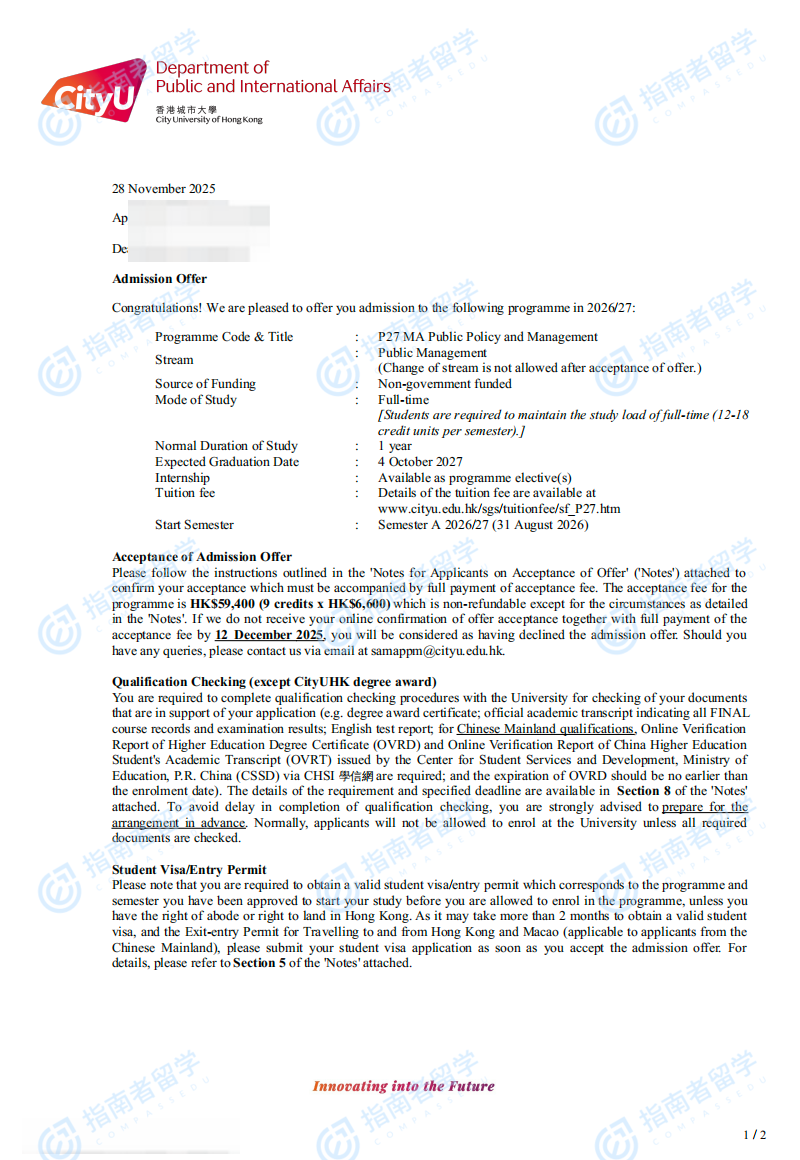 香港城市大學(xué)公共政策與管理文學(xué)碩士研究生offer一枚