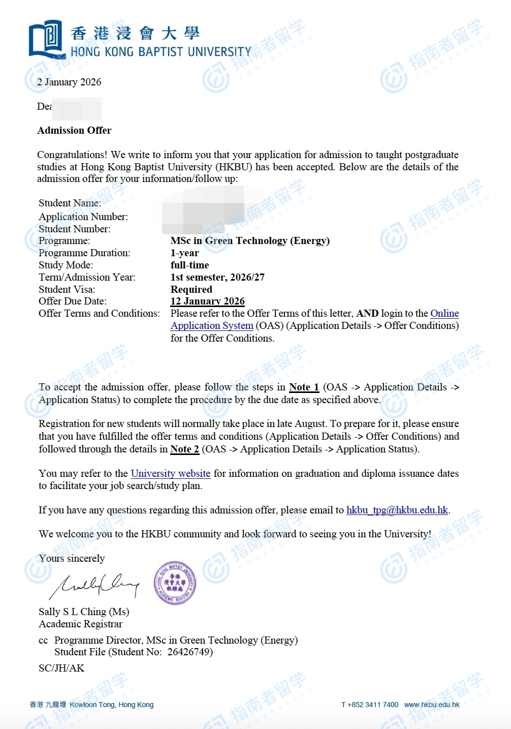 香港浸會大學(xué)綠色科技(能源)理學(xué)碩士研究生offer一枚