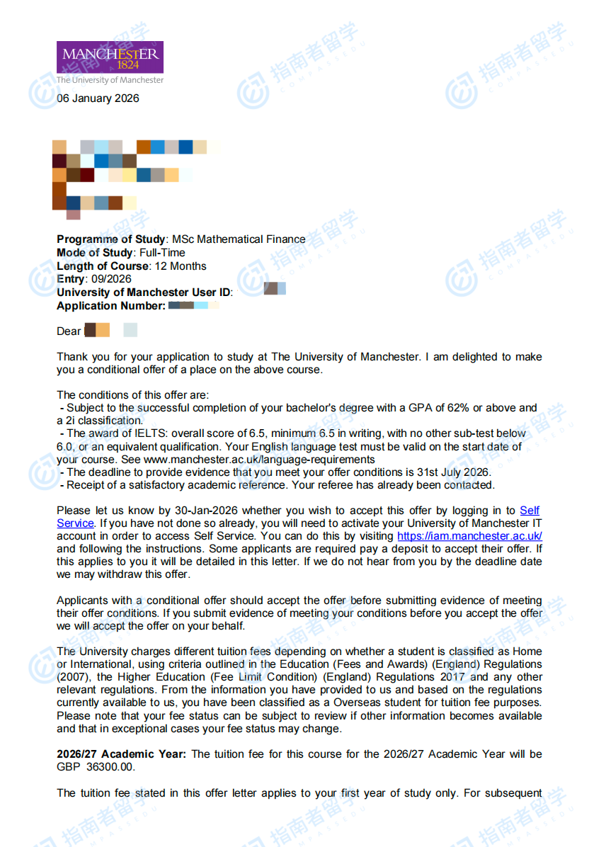 曼徹斯特大學(xué)數(shù)學(xué)金融理學(xué)碩士研究生offer一枚