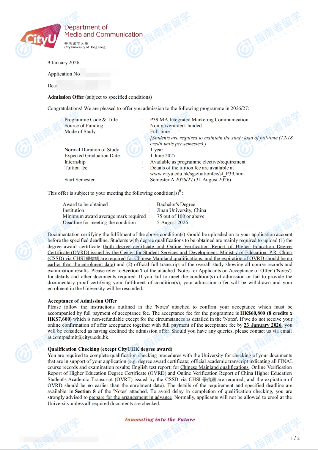 香港城市大學(xué)整合營銷傳播文學(xué)碩士研究生offer一枚