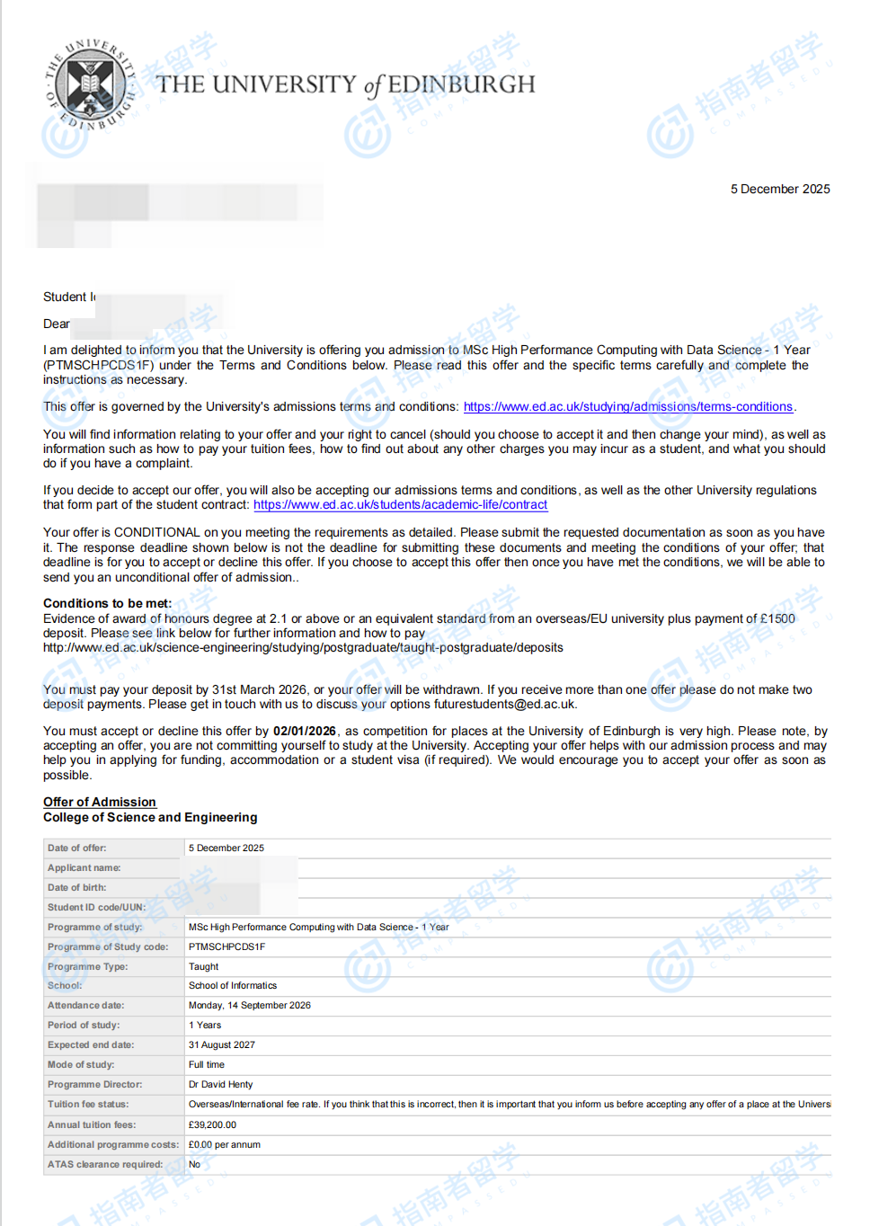 愛丁堡大學高性能計算與數(shù)據(jù)科學理學碩士研究生offer一枚
