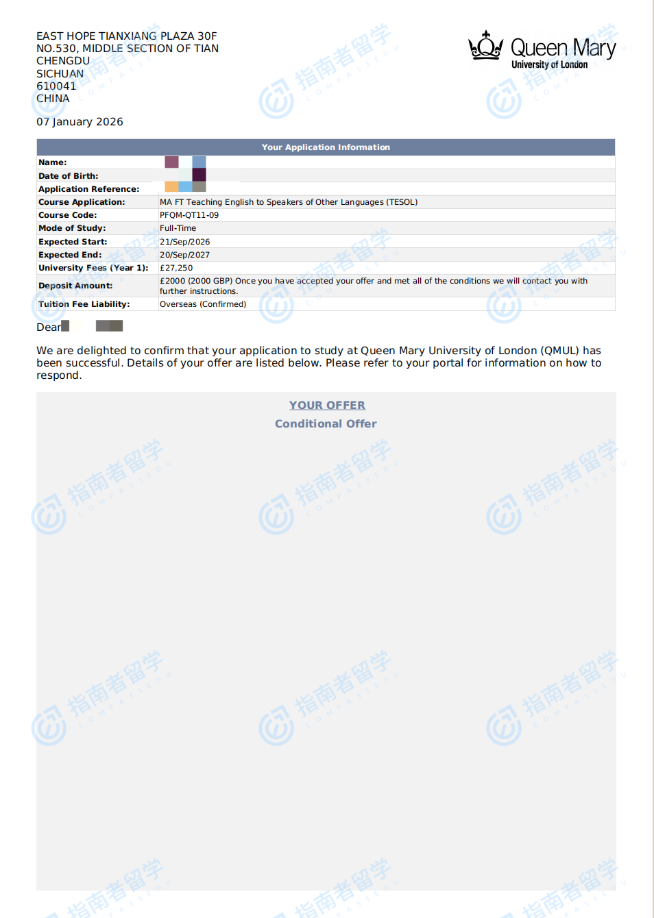 倫敦大學(xué)瑪麗皇后學(xué)院對(duì)外英語教學(xué)文學(xué)碩士研究生offer一枚