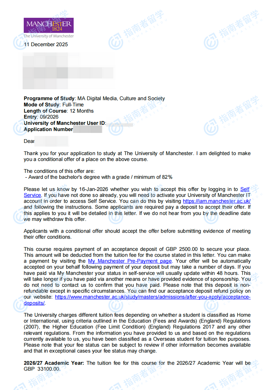 曼徹斯特大學(xué)數(shù)字媒體、文化與社會文學(xué)碩士研究生offer一枚
