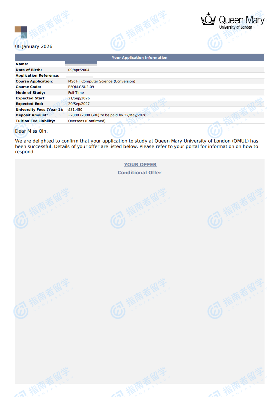 倫敦大學(xué)瑪麗皇后學(xué)院計(jì)算機(jī)科學(xué)理學(xué)碩士(可跨申)研究生offer一枚